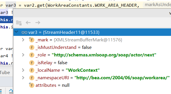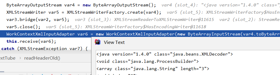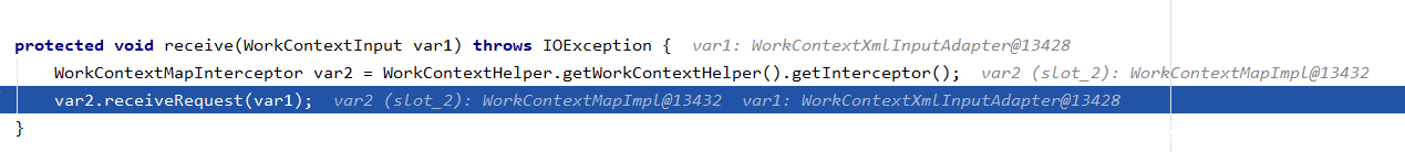 可以看到,var4作为一个ByteArray,存储了payload对应的字符串,接下来var6将一var4为参数构建一个WorkContextXmlInputAdapter,再往后就是this.receive(var6),根据调用栈的提示,我们应该跟进之。