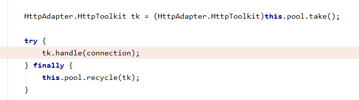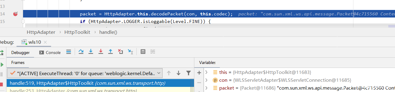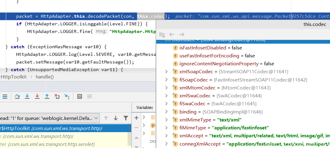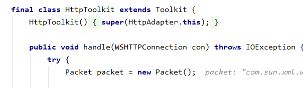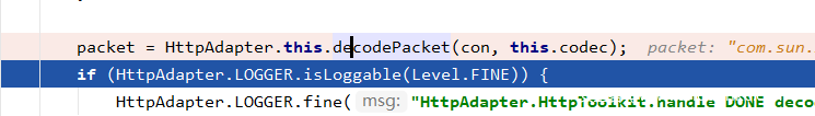 我们现在正处于HttpAdapter$HttpToolkit.handle()内,HttpAdapter$HttpToolkit.handle()的前半部分(主要是packet = HttpAdapter.this.decodePacket(con, this.codec);一句)完成了数据包的解析,并将其转化成对应的Java对象。