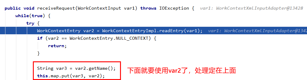 看不出什么,继续跟进WorkContextLocalMap.receiveRequest(),