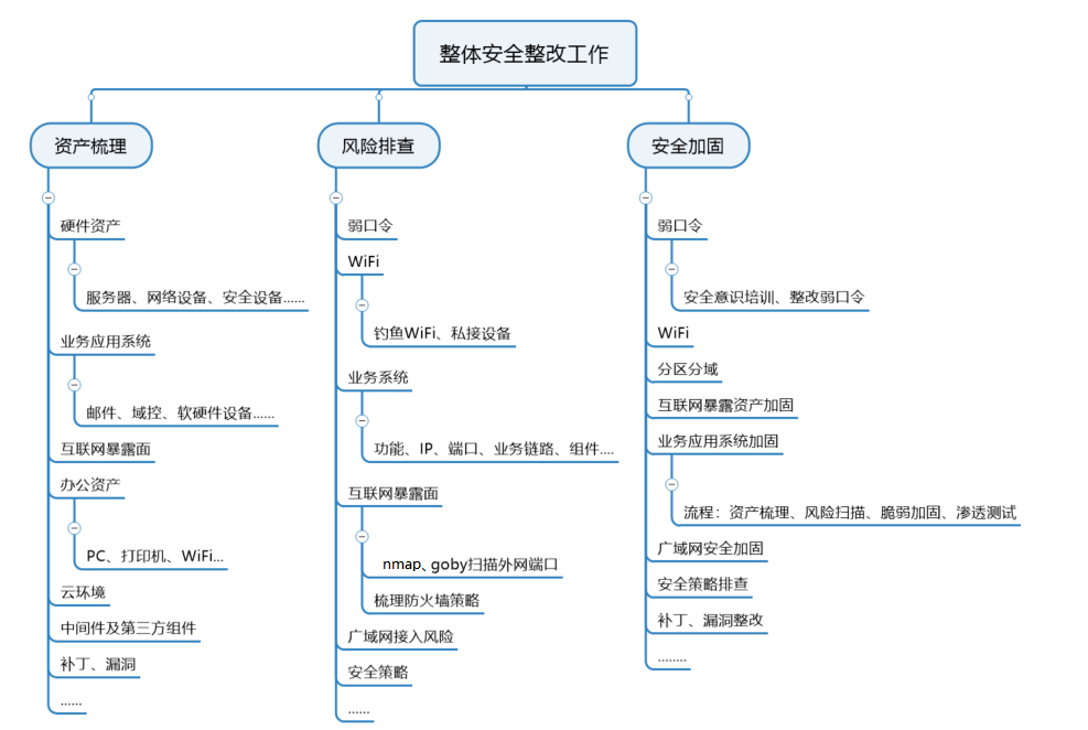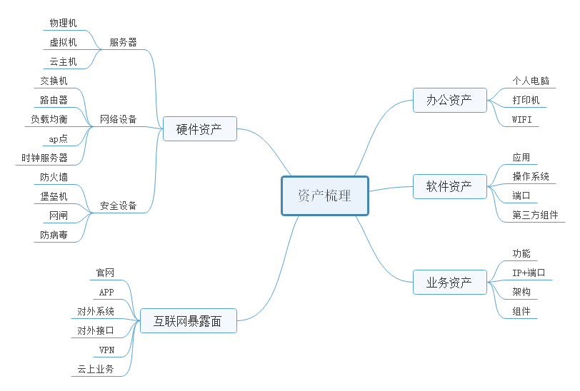 资产梳理作为整体安全建设基础,应该做到全面梳理,因为资产梳理做得是否全面将直接影响后续风险排查是否彻底。全面的资产排查应从内、外网,软、硬件,人员配备,以及安全管理制度等多方面进行梳理。资产的排查可以从多维度进行交叉排查,应该做到“宁可多查,不可漏查”,大致可以分为以下几个类别:互联网暴露资产、业务资产、硬件资产、软件资产、办公资产等类型。