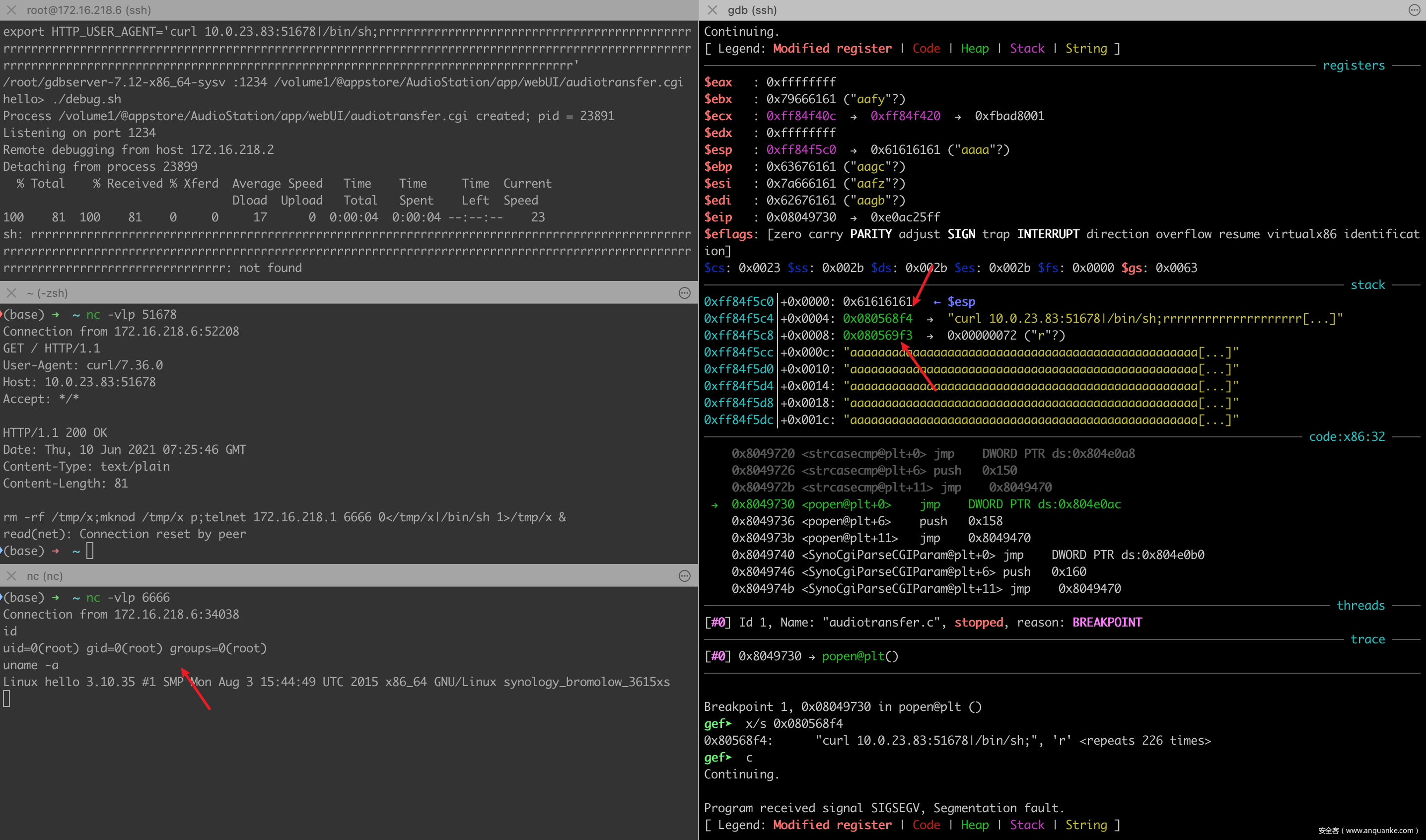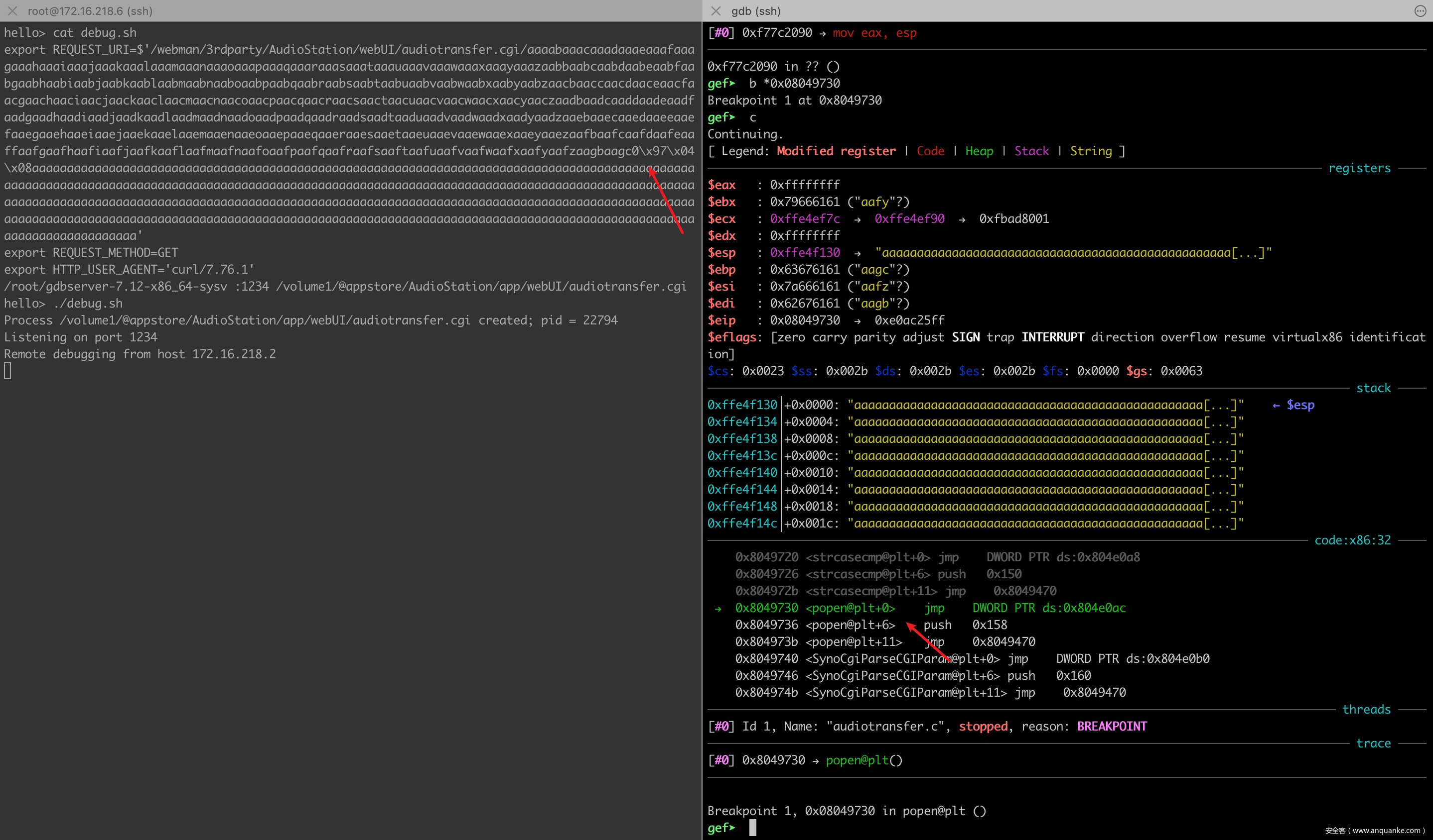 然后就是 gdb attach 到 Web 服务程序进行实际漏洞利用调试了,可使用以下代码替换 audiotransfer.cgi ,方便确认 Payload 是否被修改,以及通过 /proc/$pid/stat 得到父进程的 pid。