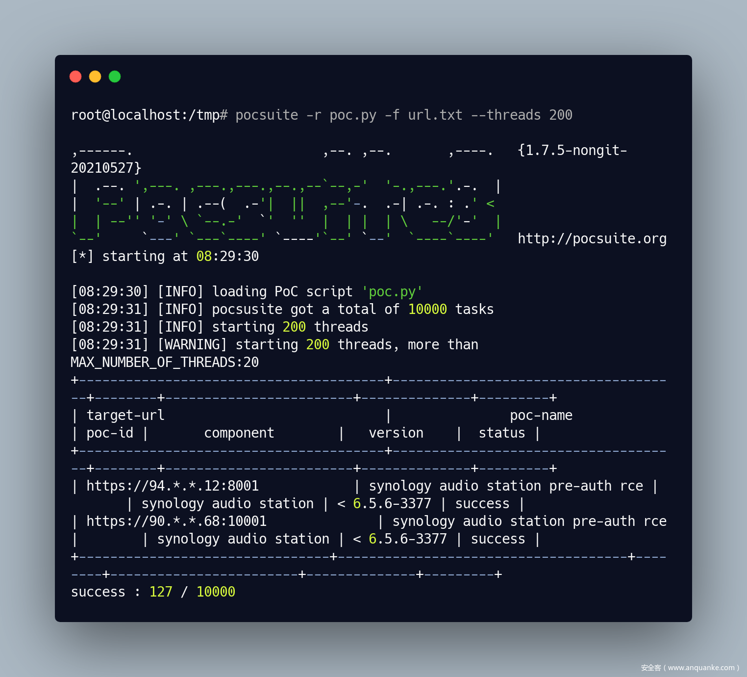 从 ZoomEye 随机抽取 10000 的目标进行漏洞检测,成功率为 127/10000。