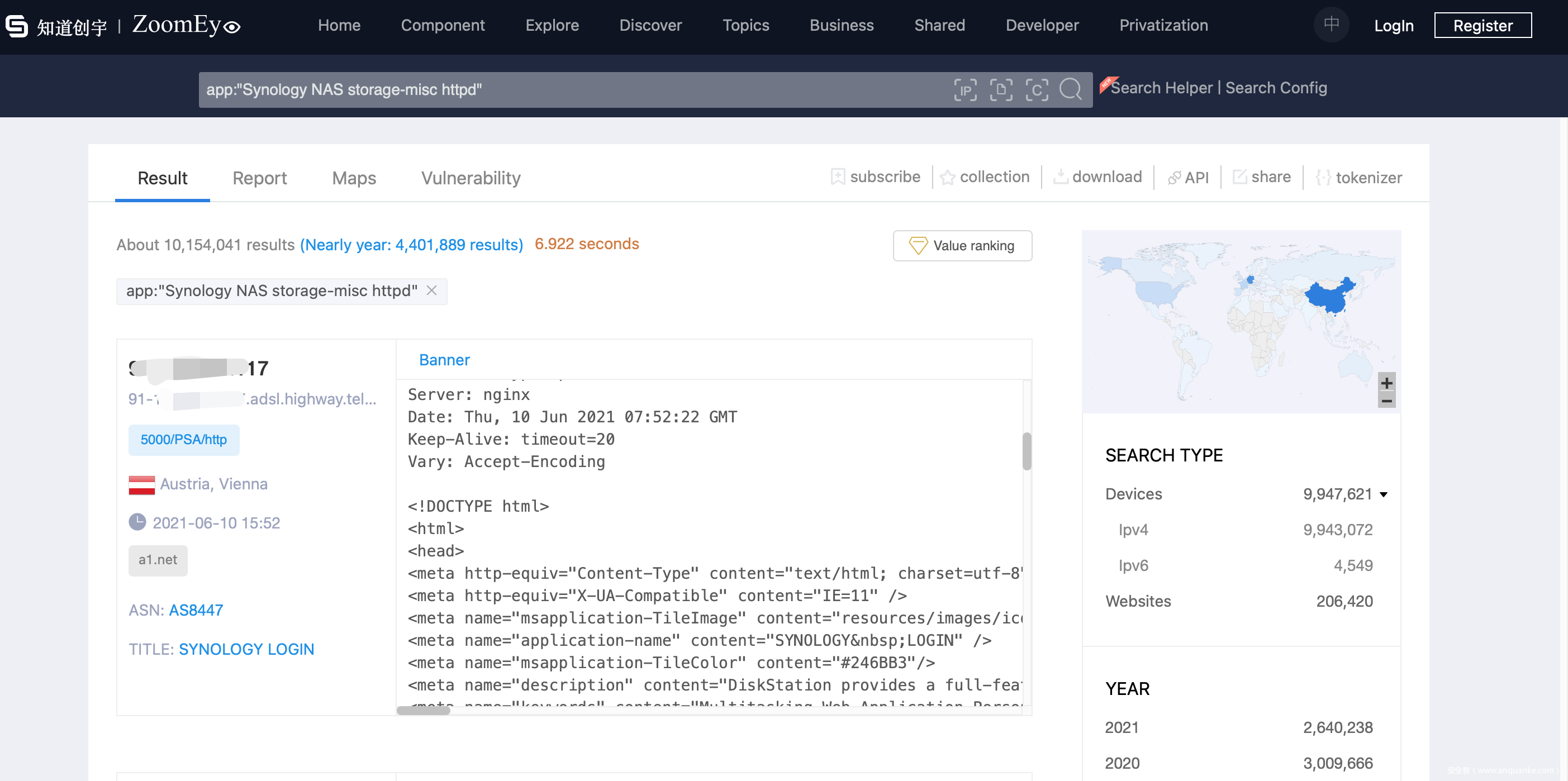 通过 ZoomEye 网络空间搜索引擎对关键字 app:”Synology NAS storage-misc httpd” 进行搜索,共发现 10154041 条 Synology NAS 的 IP 历史记录,主要分布在中国、德国【4】。安装了Audio Station 套件且版本 < 6.5.4-3367 的会受到该漏洞影响。