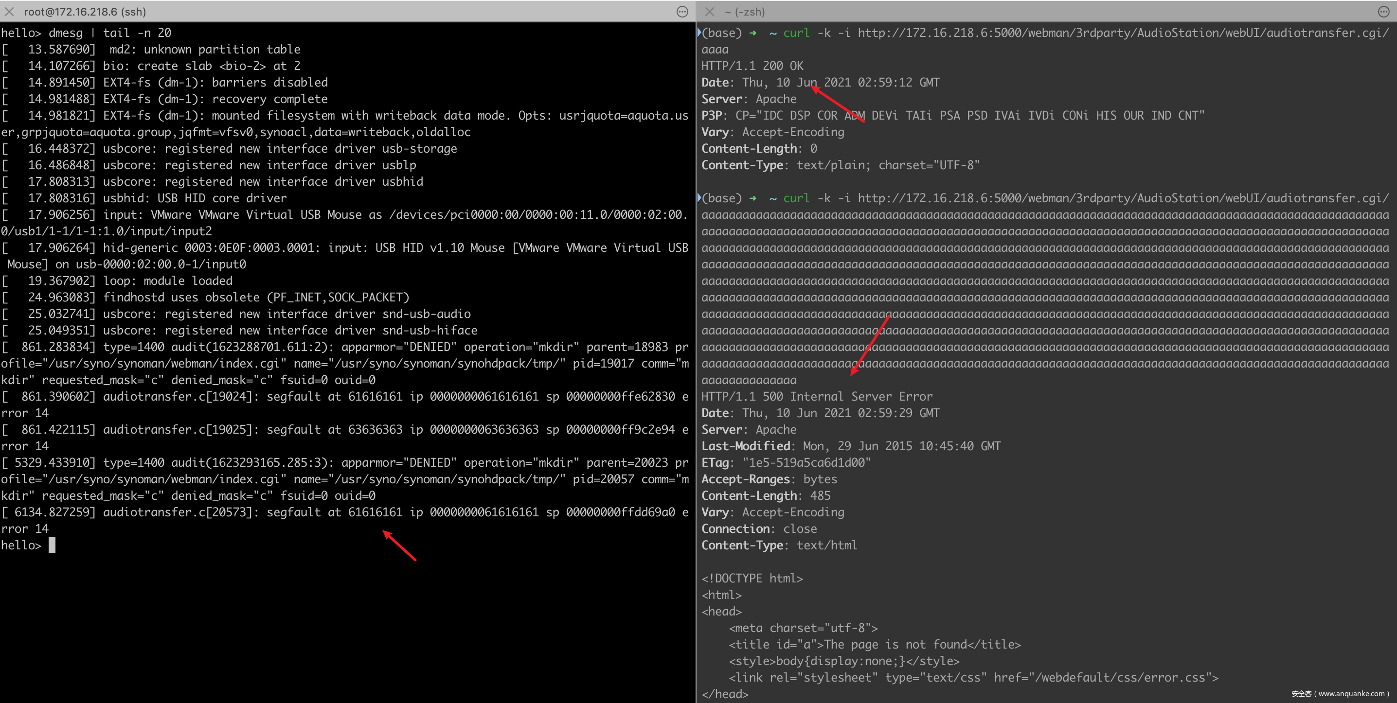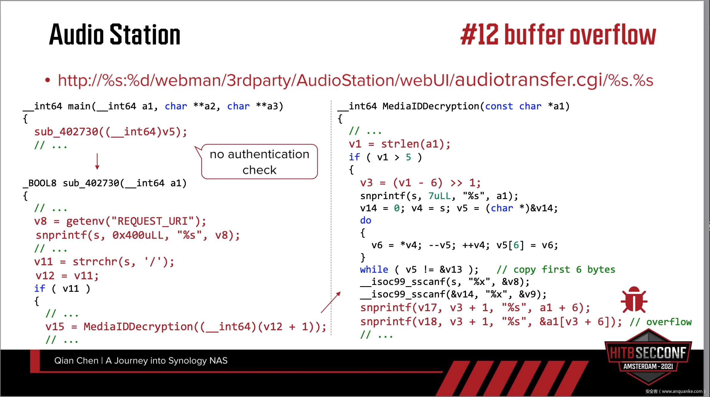 2021 年 5 月 27 日,HITB 2021(阿姆斯特丹)会议上分享了 Synology NAS 的多个漏洞【2】,Synology Calendar、Media Server、Audio Station 等套件中的漏洞可通过 Web 服务入口远程利用。Audio Station 套件的漏洞成因为 audiotransfer.cgi 存在缓冲区溢出,远程攻击者可构造特殊数据包,然后利用该漏洞以 root 权限在目标设备执行任意命令。