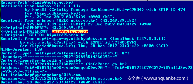 这些攻击文档中,有一份于2017年12月29日从韩国上传至VT,该文档位于某个邮件内(哈希值为6b728d2966194968d12c56f8e3691855)。邮件发送方模仿了韩国NCTC(国家反恐中心)的邮件地址,所使用的服务器IP归属地为新加坡。