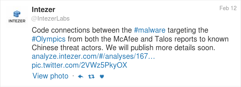 图9. 2018年2月12日IntezerLabs公布此次攻击与中国的APT组织有关