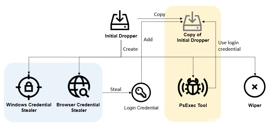 攻击所使用的主恶意软件模块是一款网络蠕虫,由多个组件组成,包括SysInternals中的合法PsExec工具、一些凭据窃取模块以及数据擦除模块(wiper)。从技术角度来看,恶意软件的目的是传播并启动wiper载荷,在接下来的60分钟内销毁远程网络共享上的文件。同时,主模块会从浏览器以及Windows存储数据中收集用户密码,生成包含历史凭据以及新收集凭据的新版蠕虫。新生成的蠕虫会推送到可达的本地网络主机上,利用收集到的凭据以及当前的用户权限,通过PsExec工具开展攻击。
