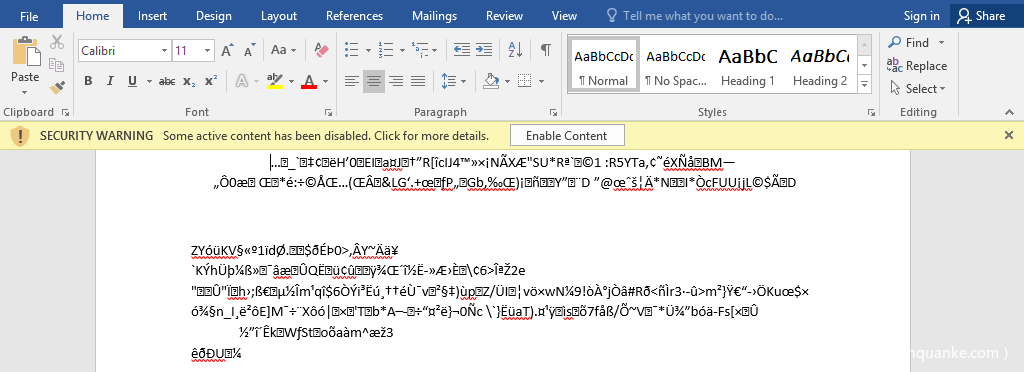 从2017年12月以来,安全研究人员观察到有些钓鱼邮件样本中的MS Office文档被上传到VirusTotal上,这些钓鱼邮件都与冬奥会有关。文档内容不多,只包含一些乱码文本,让用户误以为文档编码存在问题,诱导用户按下“启用内容(Enable Content)”按钮。