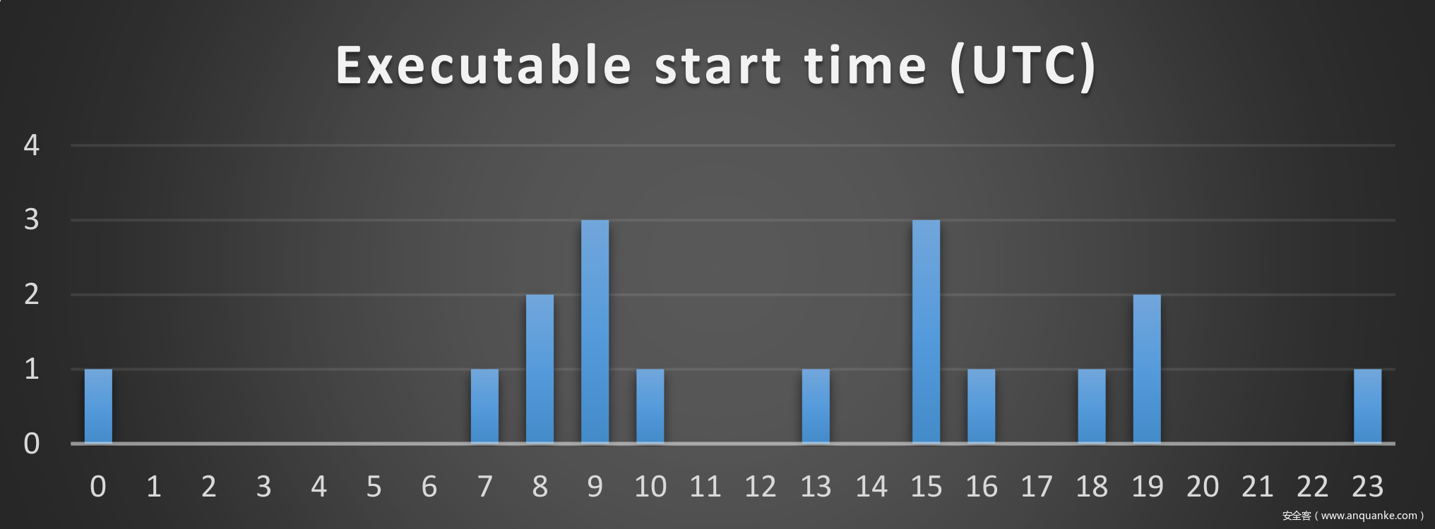 收到这些监测数据后,我们构建了攻击者的活动时间线以及直方图,可以显示攻击者何时在系统上运行可执行文件,如下图所示: