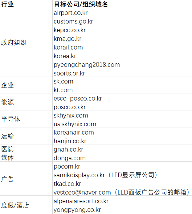 攻击者在搜索以这些域名结尾的邮箱地址时似乎采取了广撒网的策略,并没有特别精确。使用诸如sk.com或者kt.com之类的短域名并不是个好主意,以sk.com以及kt.com为域名结尾的某些完全不相关的公司同样收到了钓鱼邮件,很多人没有注意到这一点,这些公司的域名如下。