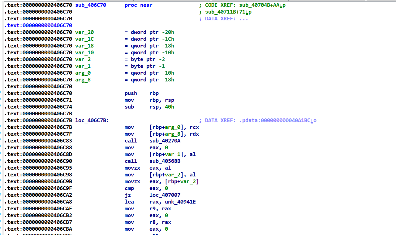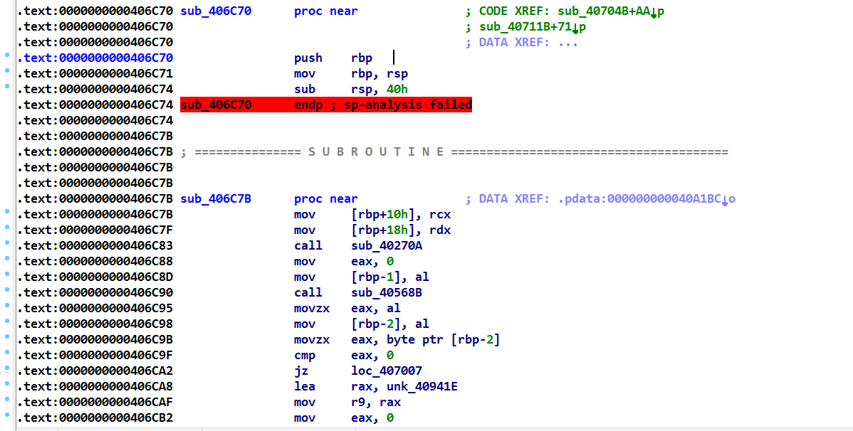 在我们使用IDA静态分析的话不管是使用IDA6.8还是7.0或者是McAfee的分析师使用的最新IDA7.2版本都会出现错误导致反编译失败,并且函数都会识别出错一个好好的函数硬生生给截断了两个函数,如下图所示的sub_406C7B函数本来是一个函数,但是在函数开头开辟堆栈之后函数就被截断了,然后剩下的函数体又被IDA识别为了另一个函数,这可能是作者搞的鬼也可能是IDA的缺陷造成的