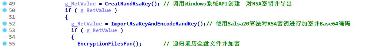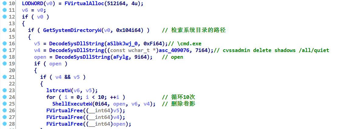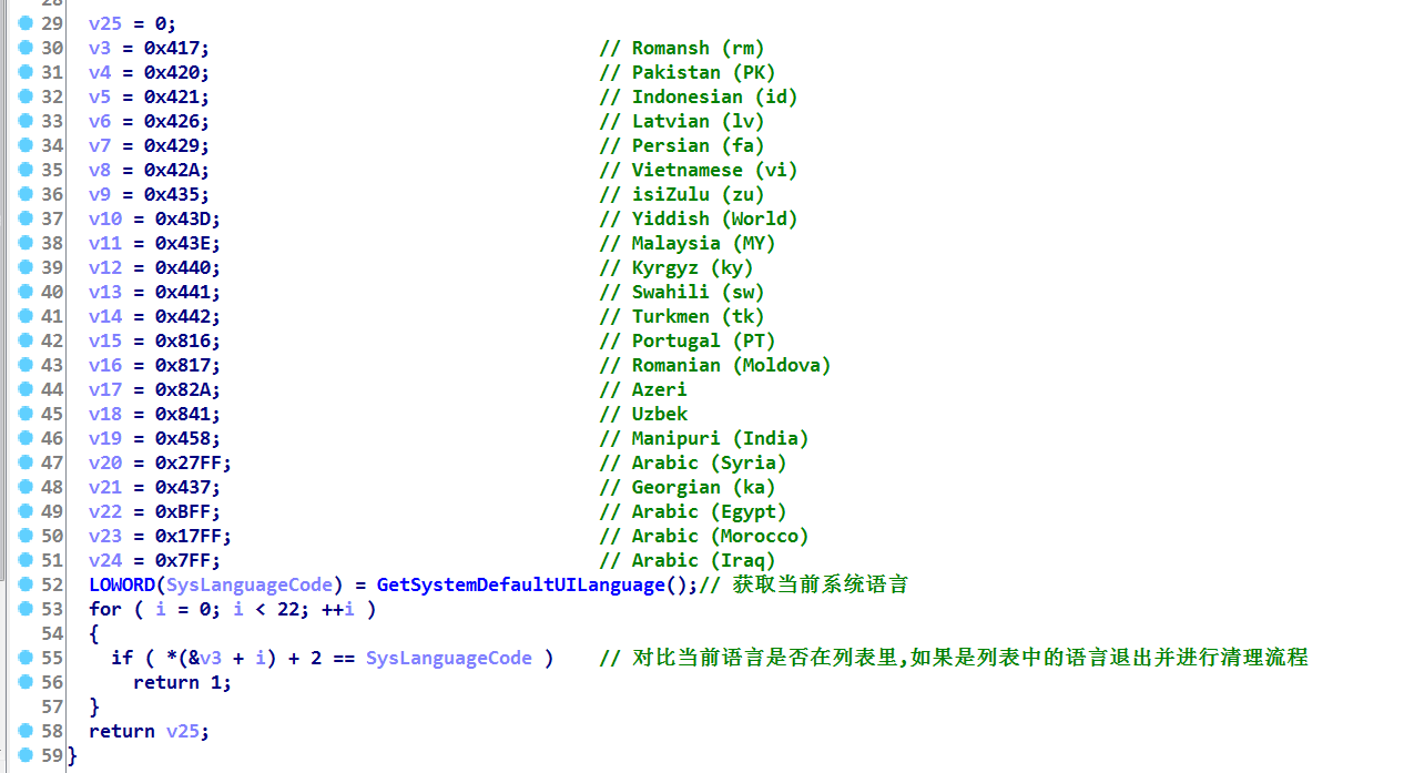 此图为CheckSystemLanguage函数内部逻辑,GetSystemDefaultUILanguage函数获取的是安装系统时第一个安装的语言,作者将这些国家排除在勒索范围之外要么就是作者就是来自这其中的国家之一,否则就另有所图了