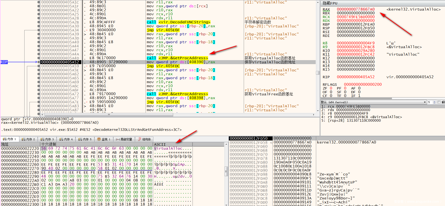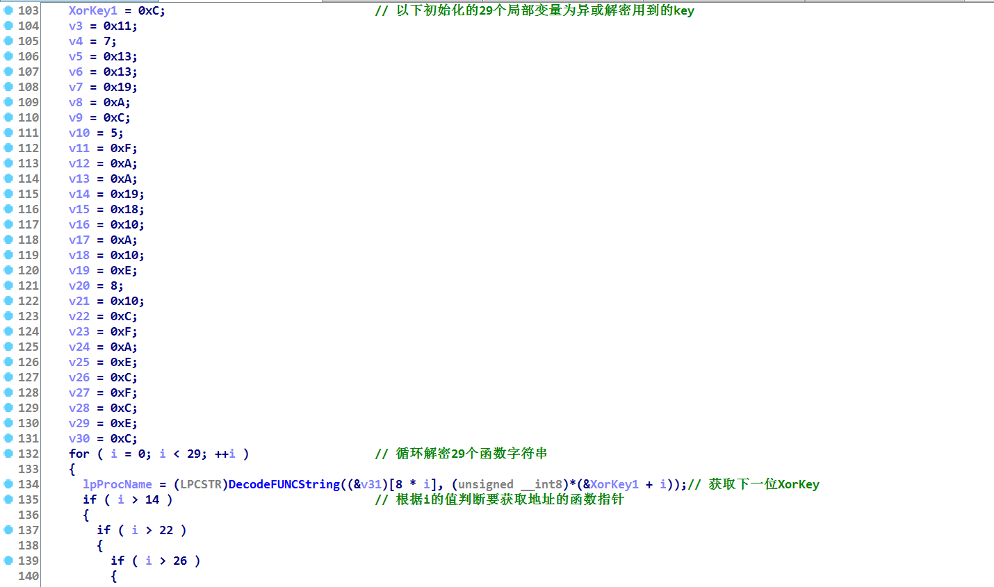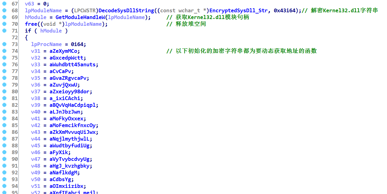 此图为DecodeKernel32DllStrAndGetFunAddress函数内部,此函数解密了异或加密的dll和函数字符串,然后获取Kernel32模块基址并使用GetProcAddress获取Kernel32模块中的29个函数地址