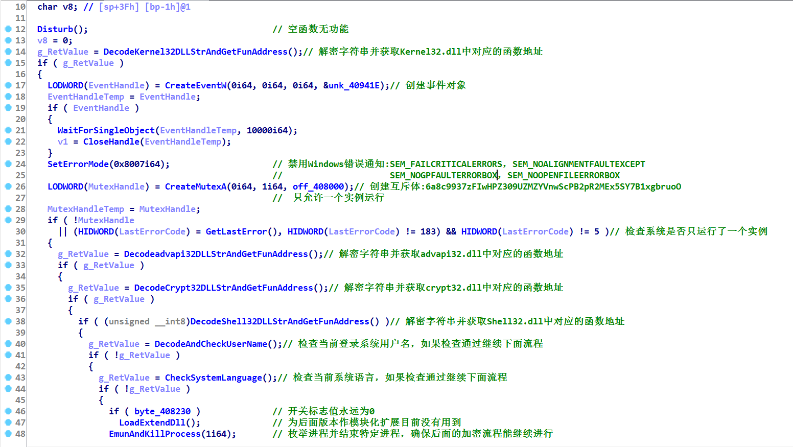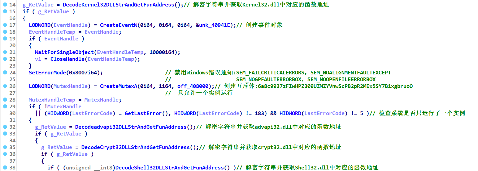 接下来主要先禁用了Windows错误通知,之后创建互斥体确保系统中只有一个病毒样本实例运行,之后的3个Decodexxxx函数和上面详细分析过的DecodeKernel32DllStrAndGetFunAddress函数功能都一样只不过是获取另外3个dll中的函数地址罢了,所以就不详细分析函数内部逻辑了