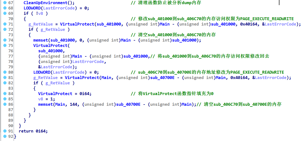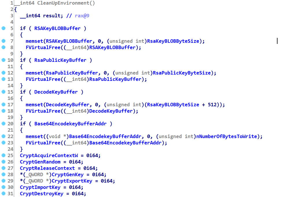 CleanUpEnvironment函数清空了用到的各种密钥,还有将所动态获取的函数地址清空