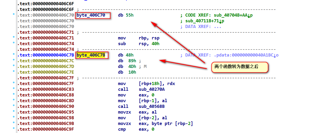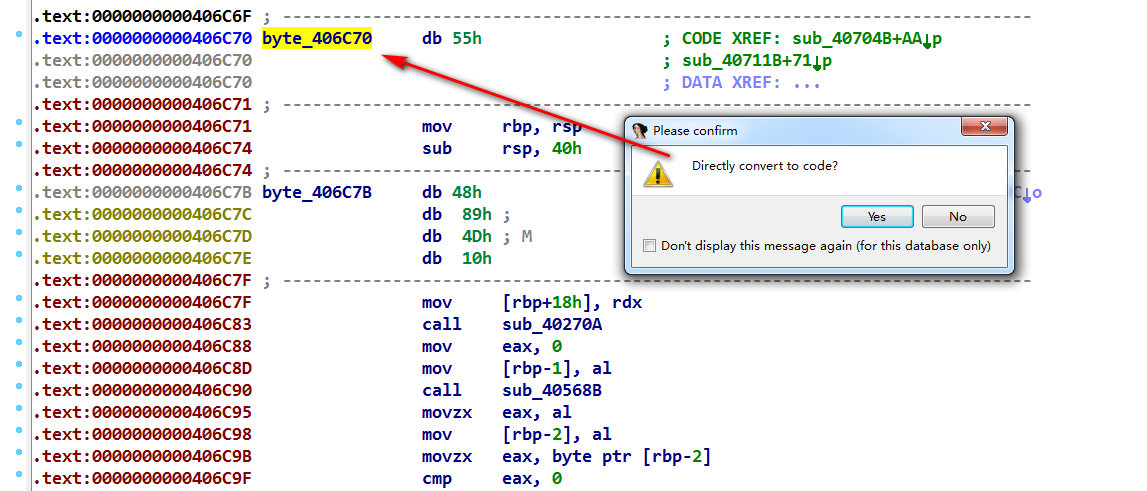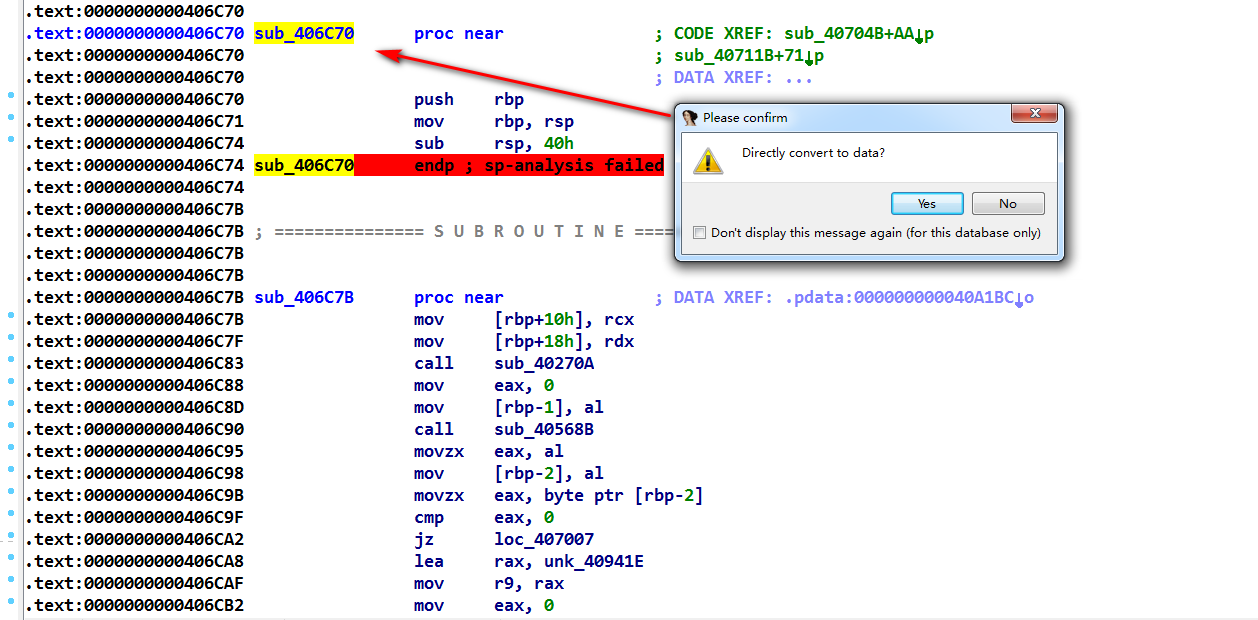 这对于我们进行静态分析和身为强迫症的我来说太难受了,如是乎在查阅了一大堆资料之后,找到了能够解决的方法,首先我们点击sub_406C70函数然后按快捷键D将代码转为数据,点击确认之后sub_406C7B函数也是一样的操作
