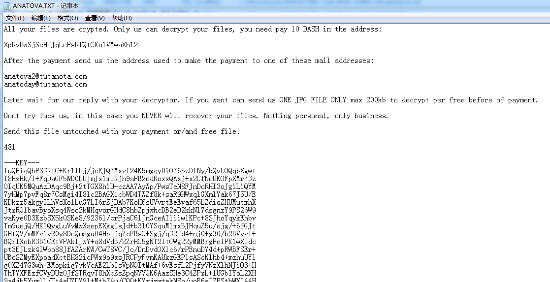 此为留下的勒索信息,根据勒索内容我们需要支付10个达世币才能解密我们的文件,按照现在的行情来说10个达世币价值5800RMB左右,我们可以发送200kb的JPG图片文件免费解密测试