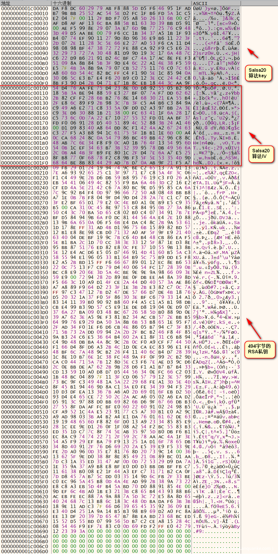 此Buffer为用来加密当前文件的Salsa20算法Key和IV,使用RSA加密之后