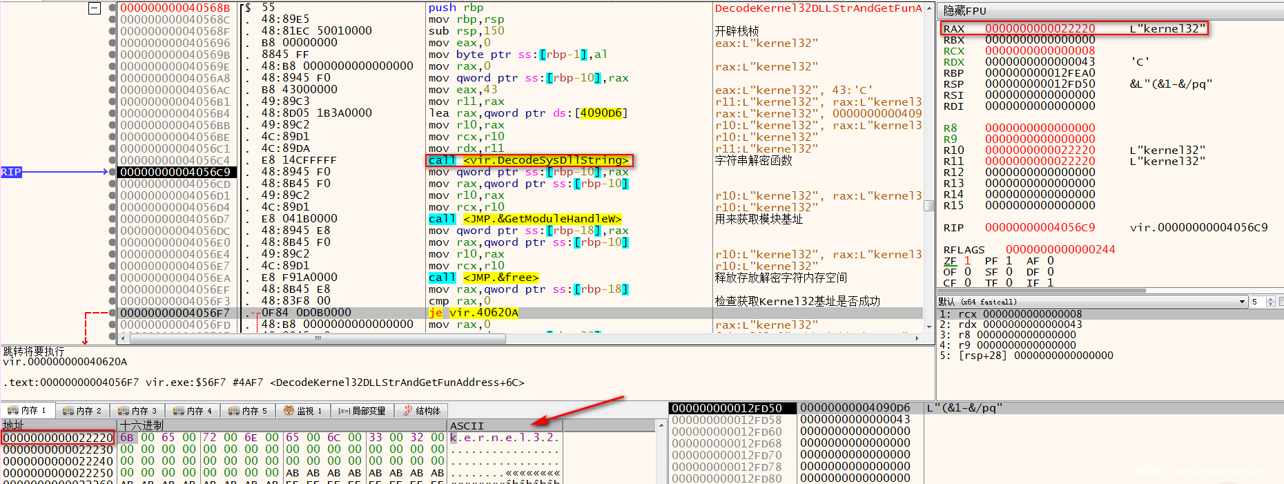 调用DecodeSysDllString函数后解密的Kernel32字符串