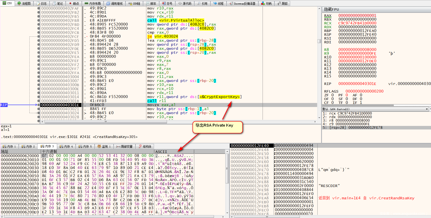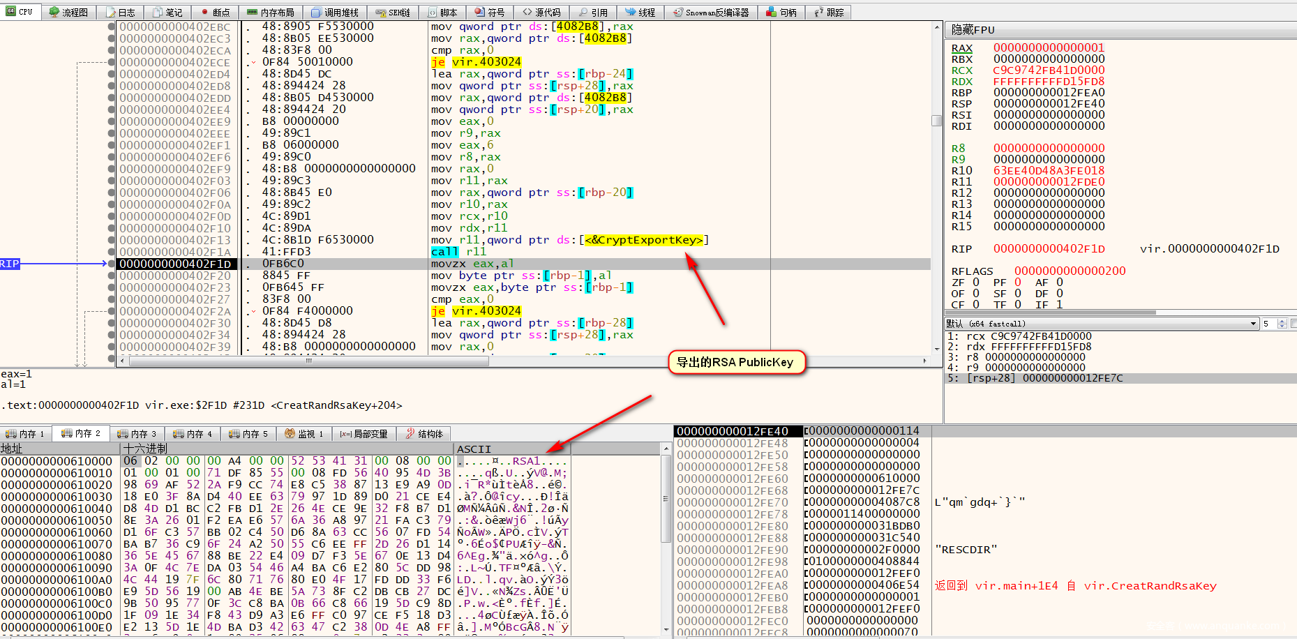 我们分析CreatRandRsaKey函数内部,主要就是生成了一对RSA密钥并导出