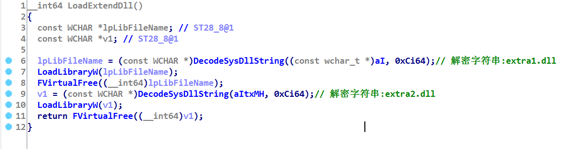 此图为LoadExtendDll函数内部主要解密了两个dll模块名称并加载这两个模块