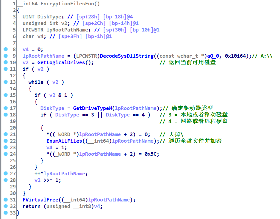 接下来分析主要的EncryptionFilesFun函数,此函数主要判断可用的磁盘并对可用磁盘进行全盘加密,对网络磁盘也会进行加密