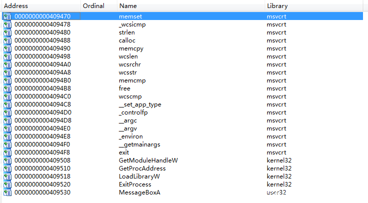 我们用IDA查看样本的导入表可以发现GetModuleHandleW,GetProAddress,LoadLibraryW这三个API可以判断使用到的函数地址都是通过这三个API组合获取