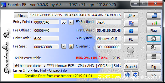 EXEINFO查看样本是64位程序编译日期为2019-01-01,链接器版本位6.0应该是为VC6编译