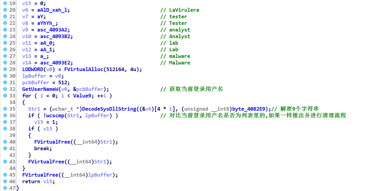 此图为DecodeAndCheckUserName函数内部逻辑主要使用GetUserNameW函数获取当前系统登陆用户名并和列表中的用户名对比,对比如果和其中之一相同就退出并进行清理流程,此举为了防止分析人员将恶意样本在某些沙箱中运行