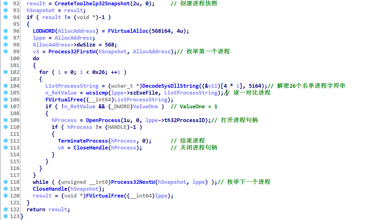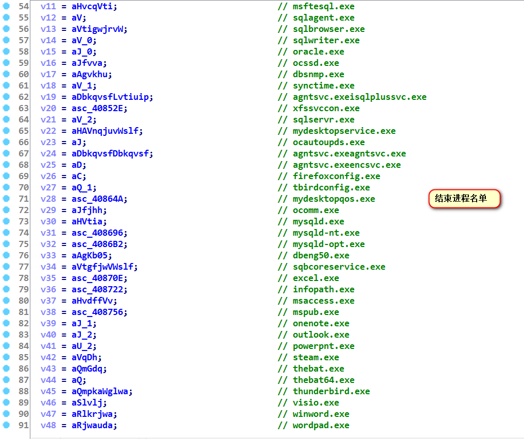 接下来分析EnumAndKillProcess函数,此函数主要逻辑就是使用windows下遍历进程的API组合遍历当前系统进程并和名单列表中的26个进程进行对比如果有相同的进行就结束,此举主要为了后续能供顺利进行加密做铺垫