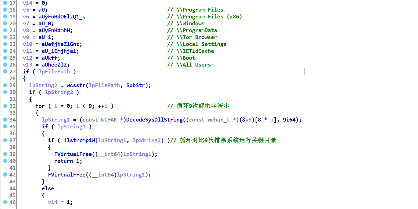 此为ExcludeSysPath函数内部主要排除对列表中的9个文件夹的加密