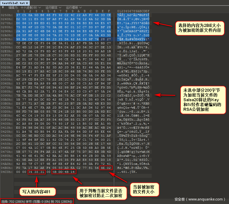 在将加密后文件内容,加密后的Salsa20算法Key和IV和文件大小,481写入文件后,将4字节加密记号写入文件末尾