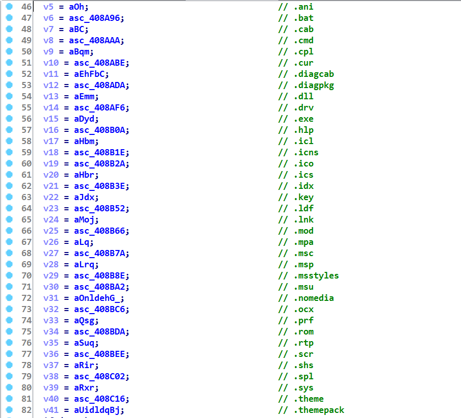 FileExtensionCheck函数对要加密文件的扩展名做检查排除对列表中的37个类别文件扩展名进行加密