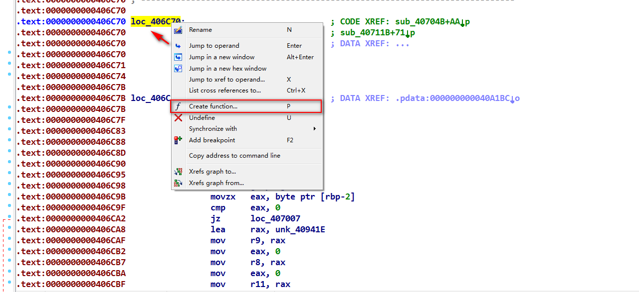 接下来我们在已经转换为代码的sub_406C7B函数右键选择创建函数.