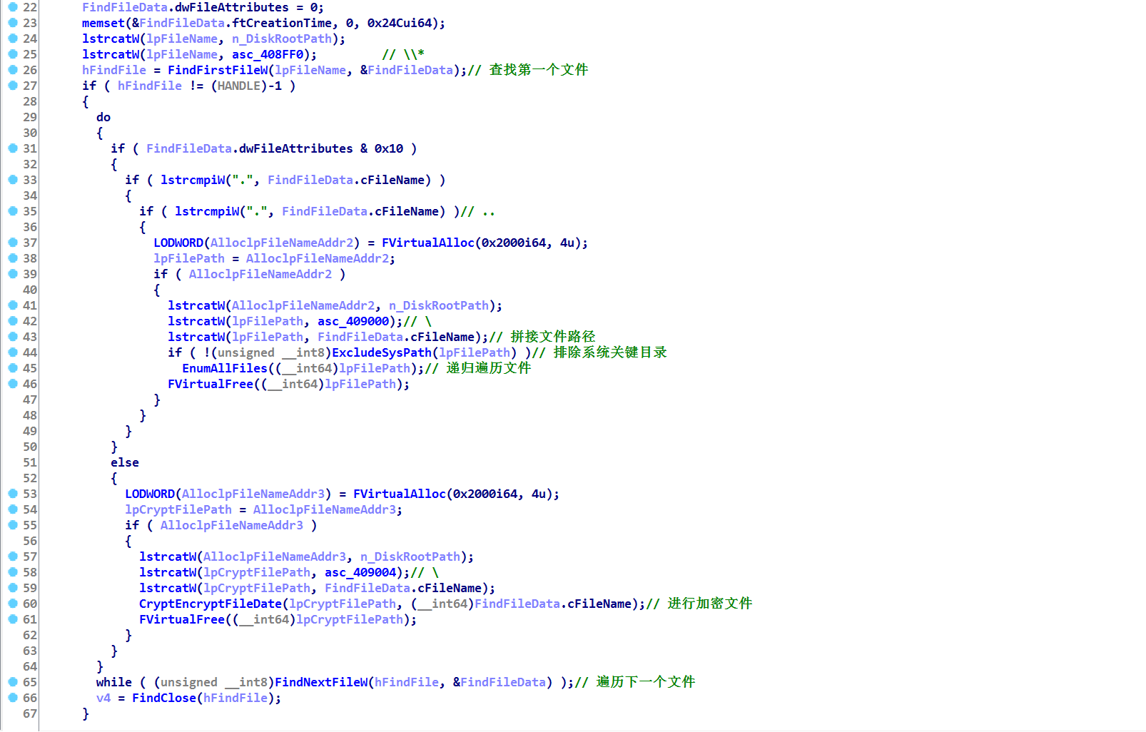EnumAllFiles函数内部主要就是遍历全盘并加密