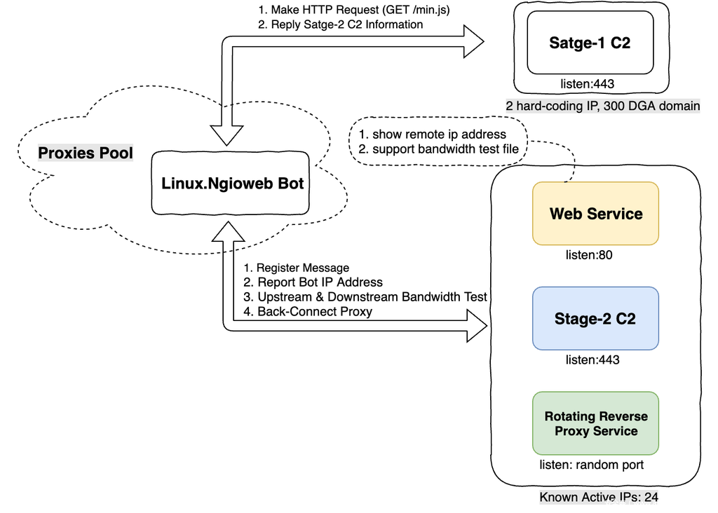 Linux.Ngioweb Bot样本的主要功能是在受害者的机器上实现Back-Connect Proxy[3]。攻击者将多个Bot构建为一个Proxies Pool,并通过双层C2协议控制,然后提供Rotating Reverse Proxy Service。