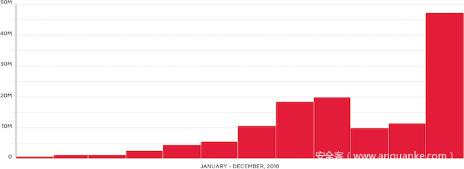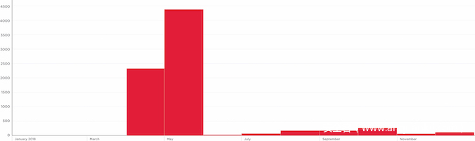 修复补丁发布后,研究人员于2018年4月12日至25日公布了漏洞利用的细节。下图展示了该漏洞的威胁趋势,可以看到,漏洞利用的威胁在2018年4月和5月激增,但随后,迅速消退直至平息,主要原因是及时的补丁修复流程减少了可用目标的数量。