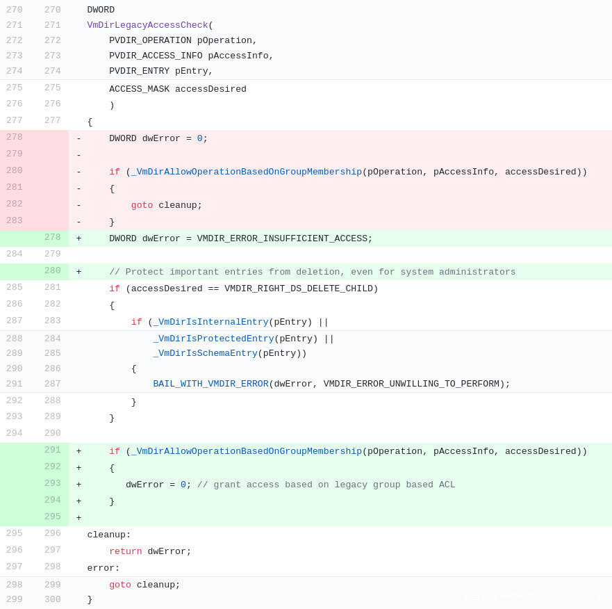 打上补丁后,如果这些条件均不满足,那么VmDirLegacyAccessCheck会返回9207(VMDIR_ERROR_INSUFFICIENT_ACCESS)。这个返回值在之前的版本中并不存在,根据这个返回值,我们找到了Github上的一个项目:Lightwave。VMware在Github上已经公开了vmdir的代码。