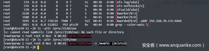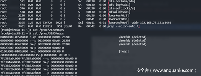 (1) /proc/maps 通常用来查看进程的虚拟地址空间是如何使用的。正常的内核进程 maps 内容为空的,伪装的内核进程是有内容标识的。如下 pid 为 2120 为系统正常的内核进程,pid 为 3195 是伪造的内核进程。