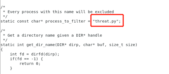 比如,我们要隐藏进程 threat.py,可以借助 libprocesshider 项目,通过修改 static const char* processtofilter = “threat.py”,隐藏指定进程。