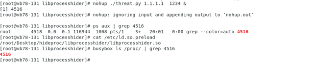 编译后将生成的 .so 文件路径写入 /etc/ld.so.preload。运行该进程后可以看到 ps 命令未检测到隐藏进程。但是使用 busybox 可以看到隐藏进程的相关信息,那是因为 busybox ps 命令直接读取了 proc 目录的数字,不调用系统预加载库。