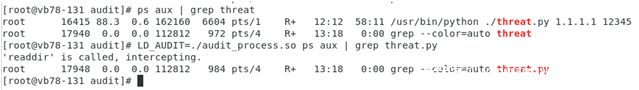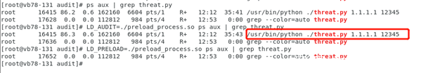 还以 libprocesshider 项目为例,我们想要隐藏运行的脚本 threat.py,如果直接编译使用 LD_AUDIT 加载 so 文件,可以发现并没有隐藏进程。