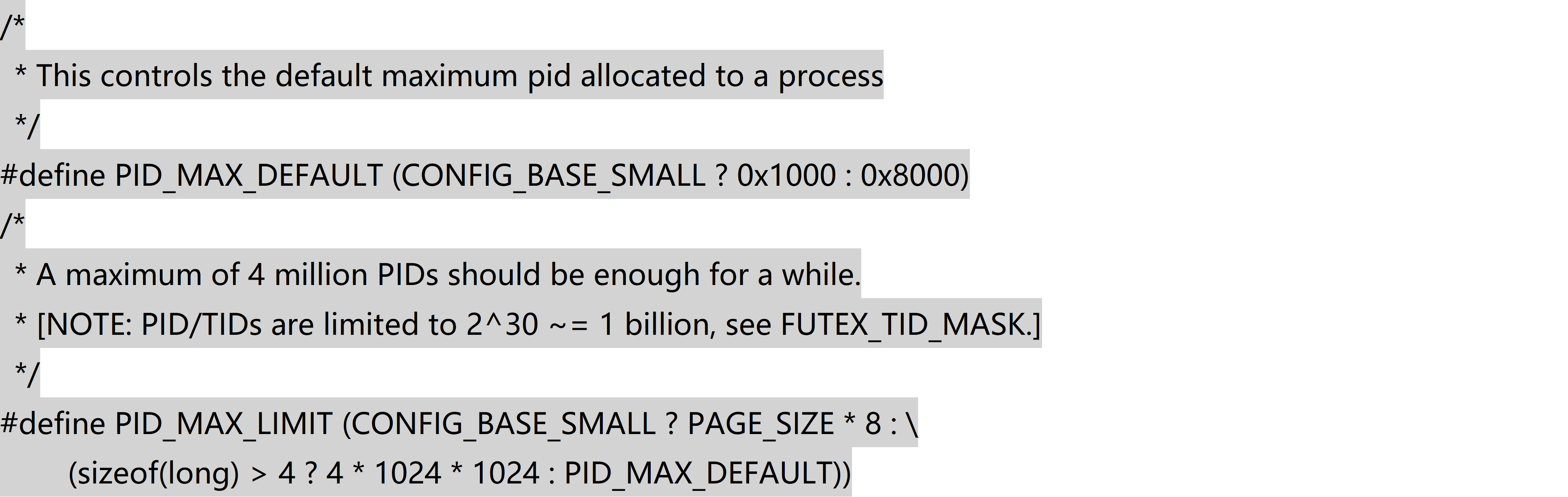 如果编译内核时设置了 CONFIGBASESMALL 选项,则pid的最大值是 0x1000,即 4096 个,否则最大值是 0x8000,即 32768 个。pid 的最大值是可以修改的,但是可以修改的最大值是多少,这个是通过 PIDMAXLIMIT 限定的,从代码可知,如果编译内核时设置了 CONFIGBASESMALL 选项,则最大值就是 8 * PAGESIZE 个大小,否则就看 long 的大小,如果大于 4,也就是最大可以设置 4*1024*1024 个,也即是 4194304 个,否则最大只能设置 PIDMAX_DEFAULT 个了。