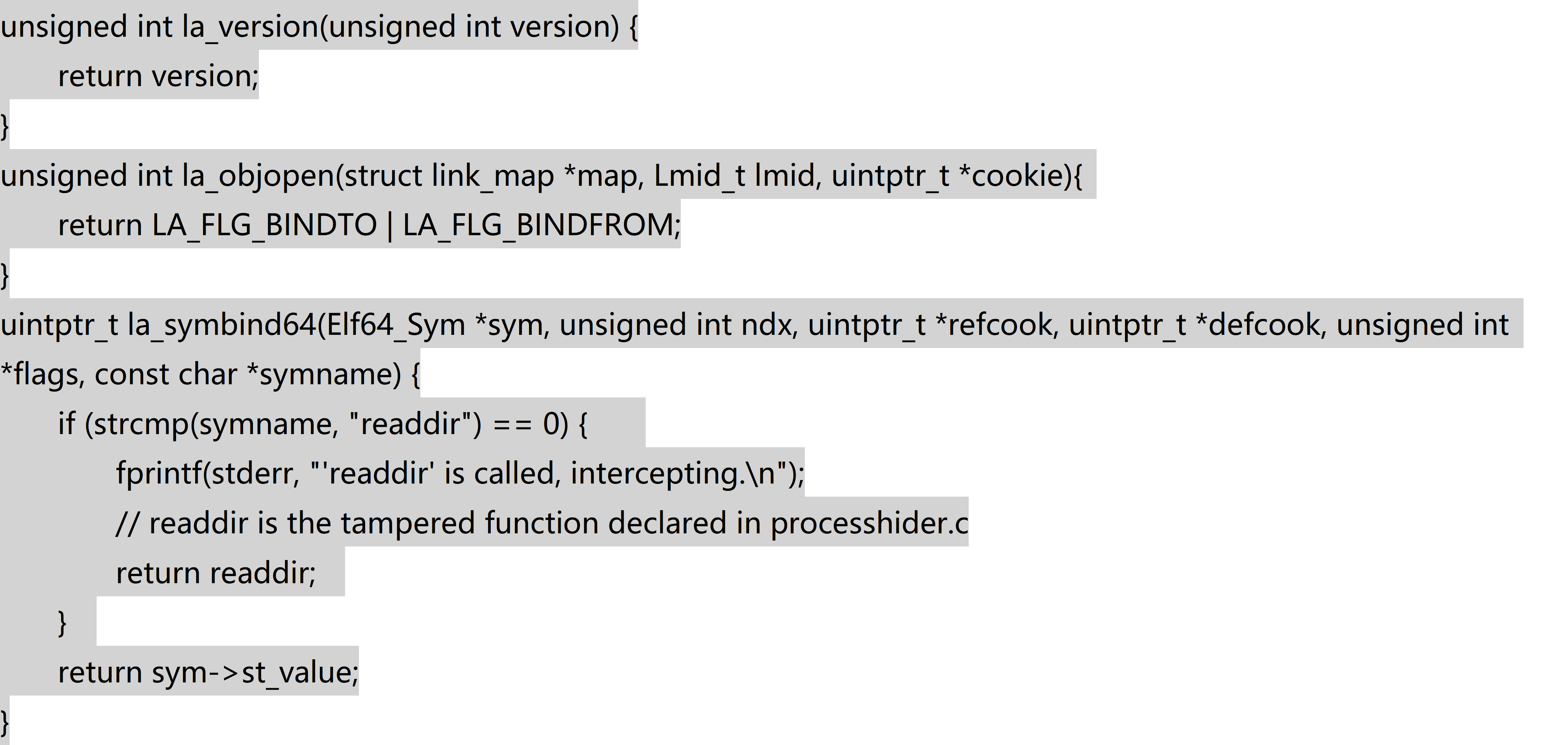 通过查询rtld-audit (https://man7.org/linux/man-pages/man7/rtld-audit.7.html)文档,可以看到调用该库需要两个函数 laobjopen 和 lasymbind64,当加载器找到并加载一个库时,将调用 rtld-audit 中的 laobjopen 函数,struct linkmap 指向要加载的库,cookie 声明一个指针指向该对象标识符,并传给 lasymbind64,lasymbind64 函数不仅可以提供信息,还可以修改程序行为。故可以在 libprocesshider.c 追加以下代码: