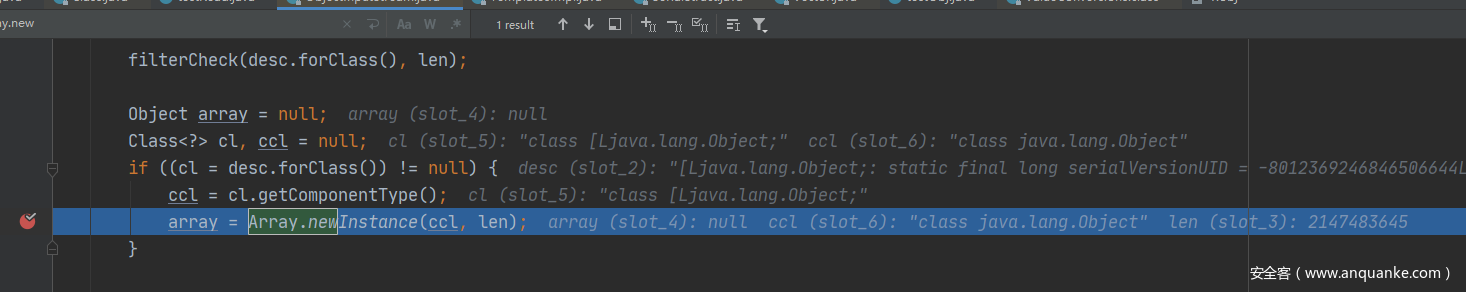 利用该技巧使我们构造数组第一个元素为“反序列化炸弹对象”,使其一直停在第一个对象的readObject流程中。
