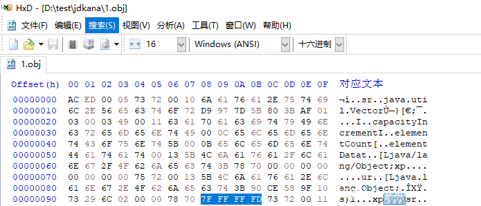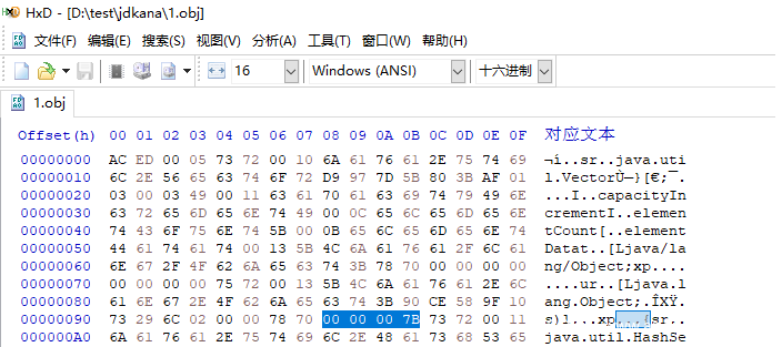 - 把Object数组的长度从123(16进制为00 00 00 7B)改成一个比较大的数(java最大允许的数组长度为MAX_INT-2=2147483645,十六进制为7F FF FF FD)通过HxD修改序列化数据中的数组长度,修改前: