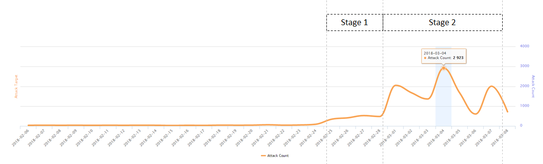 上面两图展示了每天中发生的攻击事件次数。可以看出,从2018-02-24开始,这种攻击在几天内快速发展。我们暂且将时间划分为下面这些阶段: