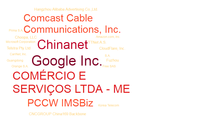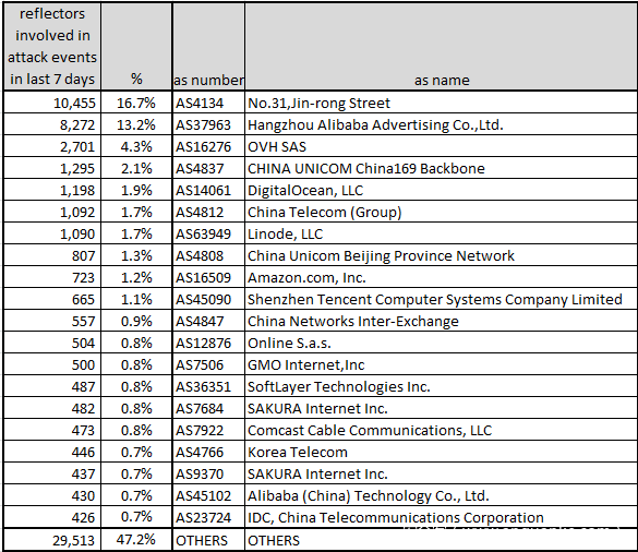 通过对所有反射点的分析,我们发现共有 62k 个反射点已经参与真实攻击事件。其中前20 的ASN 列表如下:
