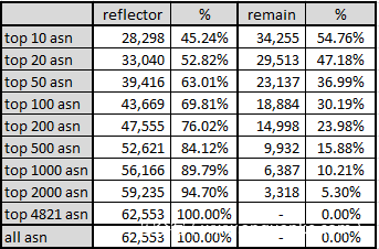 这些排名最靠前的20个ASN也仅能覆盖大约 53% 的活跃反射点,还有大约29k(47%)的反射点分布在其他 2.8k 个ASN中,如下表所示: