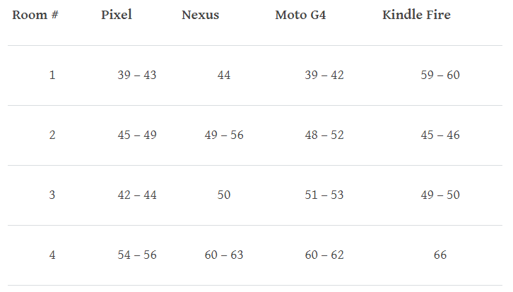 测试结果表明,在每个房间使用特定设备时,都具有不同的RSSI值范围。